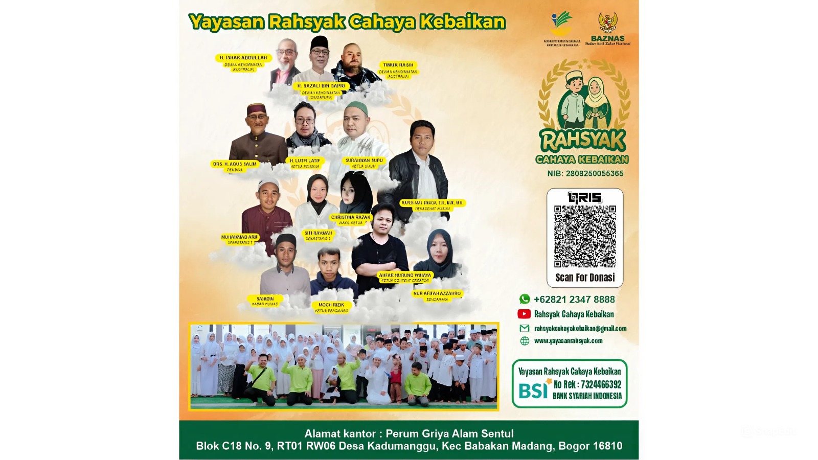 Yayasan Rahsyak adalah lembaga sosial yang bergerak di bidang kemanusiaan, khususnya dalam membantu anak yatim piatu dan fakir miskin. Kami hadir dengan semangat kepedulian dan kasih sayang, menjadi wadah bagi masyarakat yang ingin berbagi rezeki serta memberikan harapan baru bagi mereka yang membutuhkan.